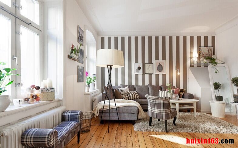本套房屋装饰的风格比较具有个性,随意的装饰不需要刻意的装点,可以带给人们一种轻松感,不受任何的拘束,想要将客厅装饰设计的自然一些,那么石膏板吊顶就一定要选用平顶式,看似简单却又刻意带给人们无限的幻想,沙发背景墙上粘贴了灰色与白色相间的竖条纹壁纸做装饰,上面悬挂了一组装饰画简单却又富有深意的画风,总会带给我们一丝神秘感,一款灰色的棉麻材质沙发靠墙而放,上面搭配了色彩素雅的抱枕做装饰,增添了设计感的同时也为客厅空间平添了一份温馨与甜蜜,厨房的面积比较大,装饰的主色彩是以白色为主,纯白的空间总会带给人们一种洁净的舒适感,餐桌就摆放在餐厅的一角,不仅方便还可以为房屋节省一定的空间,是非常实用的一种设计方式。