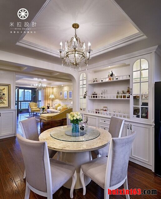 客厅中的石膏板吊顶上做了平顶式的设计,在四周处做了夹层的设计,夹层中镶嵌了一些白色的灯带,可以使客厅显得更加明亮,同时也能将中间的水晶吊灯衬托的更加华美、精致,客厅中的墙壁上也都使用了黄色带有碎花图案的壁纸做装饰,整体效果可以带给人们一种温馨感,白色的皮质沙发上搭配了黄色的抱枕,这样的设计更可以起到点缀的效果,电视背景墙上并没有过多的装饰,只是使用了白色的石膏线条做了简单的设计,大方的设计也使电视下方的一款银灰色电视柜显得更加高档,也为客厅增添了一份设计感,餐厅中的装饰主要是以白色为主,纯白的色彩可以带给人们一种洁净感,可以让人们在用餐时感觉非常的舒适。