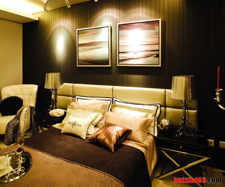客厅中的装饰色彩比较大胆,一款玫粉色的电视柜非常的吸引人,同时艳丽的色彩也显得比较时尚,地面上一款黑色的毛绒地毯与白色的皮质沙发搭配在一起,在视觉上总会带给人们一定的冲击,但这样的搭配也可以带给人们一份温馨与舒适,平顶式的石膏板吊顶是哪个没有多余的装饰,只是在中间悬挂了一盏精致的吊灯,独特的外表加上精致的做工足以让客厅内的其它装饰都黯然失色,卧室的装饰风格都有所不同,其中一间使用了黑色带有淡淡条纹的壁纸做装饰,带给人们一种神秘感,同时暗淡的色彩使房间变得更加静谧,柔软舒适的床饰却可以在沉静的空间内带个人们一丝舒适。