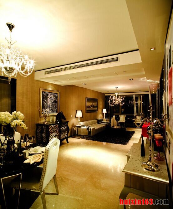 客厅中的装饰色彩比较大胆,一款玫粉色的电视柜非常的吸引人,同时艳丽的色彩也显得比较时尚,地面上一款黑色的毛绒地毯与白色的皮质沙发搭配在一起,在视觉上总会带给人们一定的冲击,但这样的搭配也可以带给人们一份温馨与舒适,平顶式的石膏板吊顶是哪个没有多余的装饰,只是在中间悬挂了一盏精致的吊灯,独特的外表加上精致的做工足以让客厅内的其它装饰都黯然失色,卧室的装饰风格都有所不同,其中一间使用了黑色带有淡淡条纹的壁纸做装饰,带给人们一种神秘感,同时暗淡的色彩使房间变得更加静谧,柔软舒适的床饰却可以在沉静的空间内带个人们一丝舒适。
