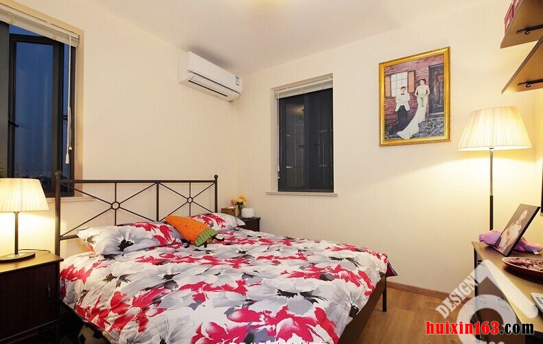 本套房屋的面积比较小,客厅中选用了平顶式的吊顶设计,这样可以使空间显得更加宽阔一些,不会带给人们一种压迫感,狭小的客厅与餐厅在同一空间内,这样可以节省一部分房屋空间,也可以使客厅显得跟家温馨一些,进门处便是厨房空间,一侧的墙壁上做了上下橱柜的设计,也可以节省一部分空间,而且也加强了空间的利用率,客厅的装饰相比之下就会简洁了一些,电视背景墙的上下方都做出了格架造型,可以增加客厅的收纳空间,同时也可以使装饰显得不那么单调,卧室中的设计比较温馨,同时也带有一丝田园风格的浪漫情调,床头的铁艺设计非常简洁,搭配上带有大花图案的床饰更可以带给人们一种温馨感。