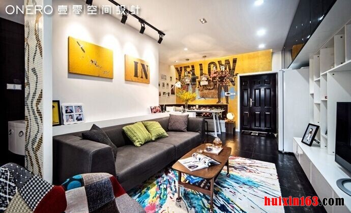 客厅中石膏板吊顶上没有多余的装饰,只是整齐的安装了一些射灯做装饰,同时为客厅增加了一定的光源,沙发背景墙的上方也安装了一排射灯,可以将背景墙上的装饰画照射的更加明亮,也可以使其显得更加突出,一款灰色的皮质沙发靠墙而放,上面搭配了一款同色系以及绿色的布艺抱枕,在彰显高雅气质的同时也可以带给人们一份温馨与舒适,一款实木材质的茶几造型小巧,但也足以凸显出设计感,地面上一款局部地毯非常具有个性,房屋是随意涂鸦的功效使其原本单调的色彩一下就变的活跃了起来,比较具有时尚气息,电视背景墙装饰相比之下比较实用,格架强的设计可以为客厅增加更多的收纳空间。