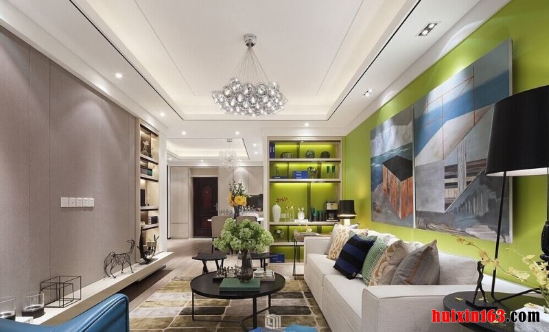 本案例的装修设计以亮色系为主,在客厅的装饰当中,大量的留白处理,营造一个惬意舒心的居室环境,平顶式的石膏板吊顶,搭配上一盏个性华丽的水晶吊灯,别致的造型让空间显得更加的时尚唯美,整体空间在色彩搭配和造型的设计上给人营造出一种新颖感,青色的沙发背景墙,鲜明的色彩反差正好起到一个点缀的效果,两幅壁画的悬挂也为空间展现出一种艺术的氛围,一张简单的茶几摆放,添加上一束花卉让空间显得更加美好,反观餐厅的而设计,其吊顶的造型和餐桌上一束花卉的添加更是凝聚着空间的视觉焦点,简单的餐具摆放以及高脚红酒杯的添置,让餐厅也不失时尚与浪漫。